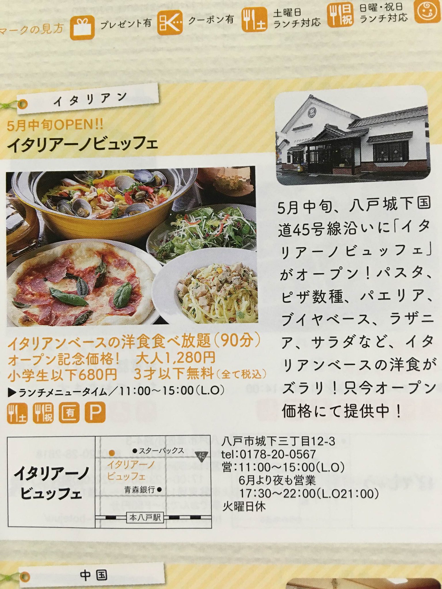 こんばんわ。。。 ペコッターに慣れてきました(o^^o) 楽しく使わせてもらってます。 それでなんですが、この前市内の雑誌を見たら 八戸の城下のあたりに、イタリアンのビッフェが 五月の中旬に開くと書いていたんですが、 わかる方っていますかね(^_^;) 気になっているんですが。。